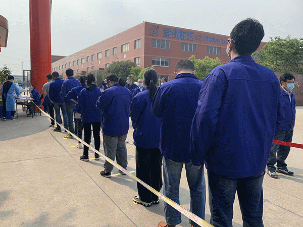 根据上级文件精神指示,4月19日下午,常州液压成套设备厂有限公司配合开展全体员工及邻厂单位全员核酸检测,为安全生产筑牢“防护墙”。