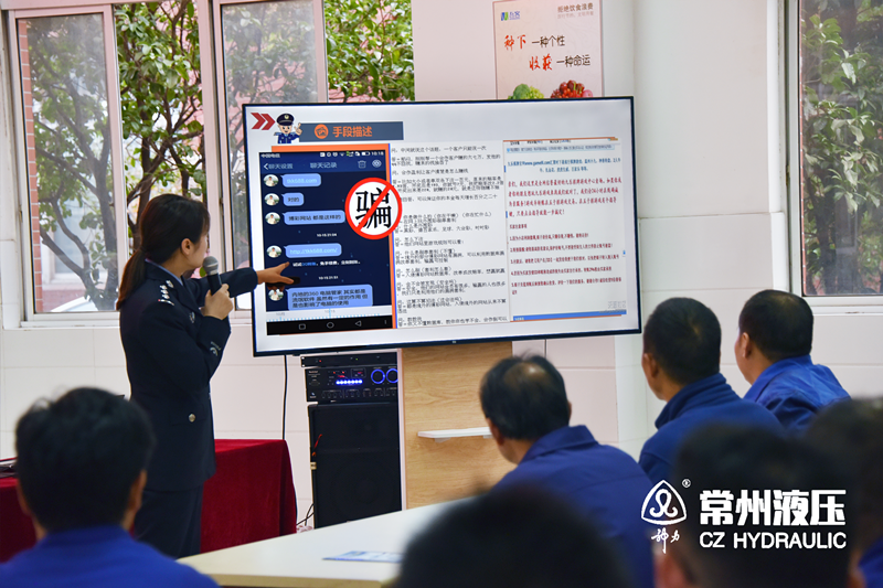 针对当前各类诈骗警情持续多发高发、诈骗手法变化多样的情况,为进一步增强企业员工安全风险防范意识,提高对诈骗信息的甄别、抵御能力,常州液压成套设备厂有限公司举办谨防诈骗宣教活动,邀请了常州市公安局武进分局钱警官担任主讲,由常州液压总经办朱主任主持,全体职工参加了此次活动。