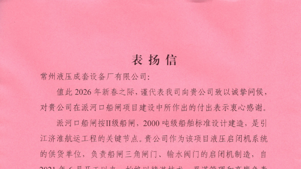 摘要:近日,常州液压成套设备厂有限公司收到了一封来自安徽省引江济淮工程相关单位的表扬信。信中对常州液压在派河口船闸项目建设中展现出的精湛技术、严谨管理和高度负责的态度表示衷心感谢,并特别肯定了公司“精工细作、信守承诺”的企业精神。这封跨越新春的谢意,不仅是一份荣誉,更是对常州液压深度参与国家重大战略